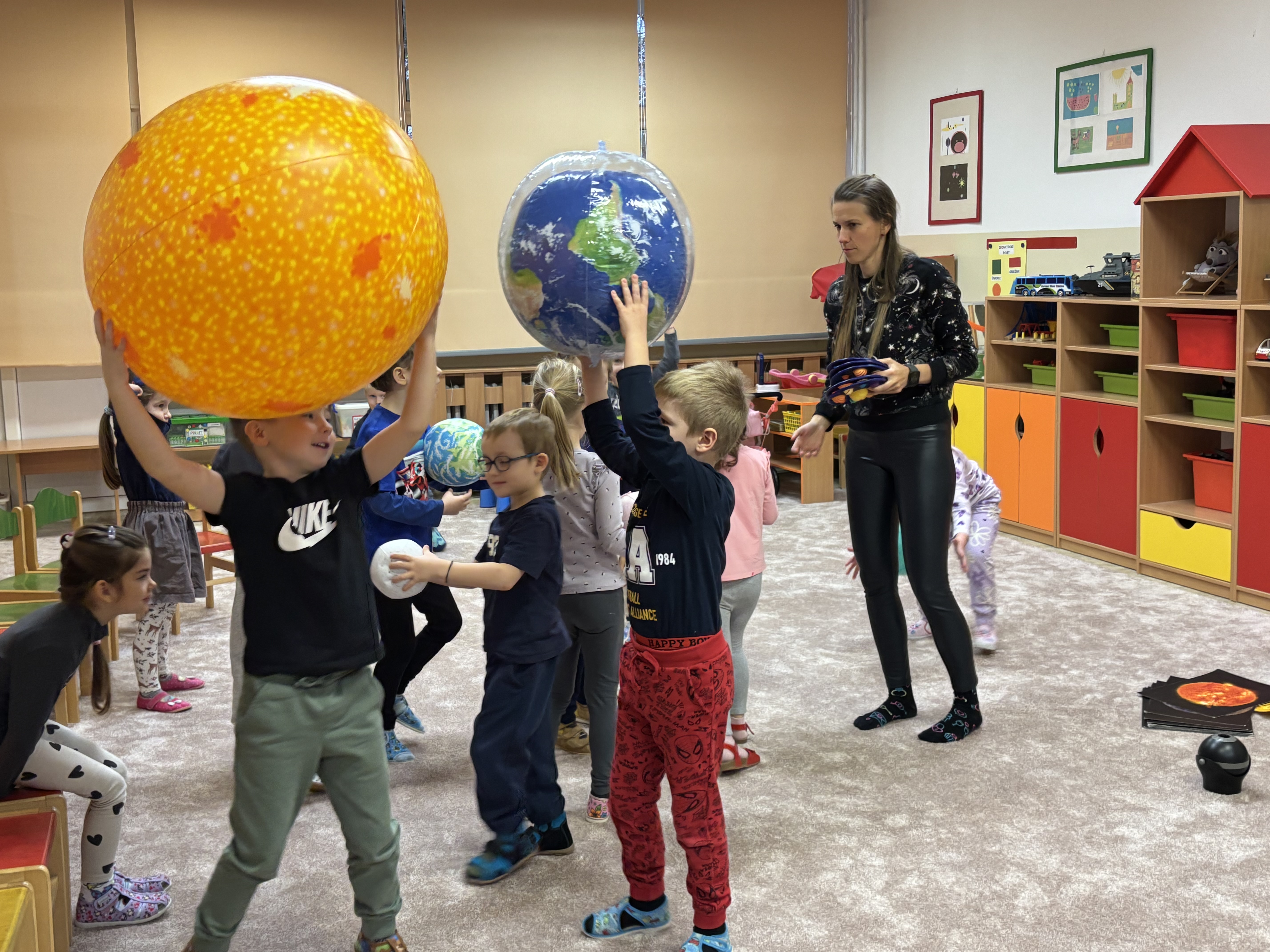 Teta Ľubka Hujsová nás preniesla do časti vesmíru! Spolu sme sa s deťmi točili, ako sa všetko vo vesmíre točí, až sa nám hlava zatočila ???? Predstavila deťom rodinu Slnka a jeho planéty, krátery na Merkúre, teplo na Venuši, Olympus Mons na Marse, Veľkú červenú škvrnu na Jupiteri, prstenec Saturnu, deti sa váľali ako Urán a vietor na Neptúne. Znázornili si striedanie dňa a noci, pozerali sa na svet cez viacero typov ďalekohľadov a spoločne pozorovali súhvezdia. A ešte oveľa viac…