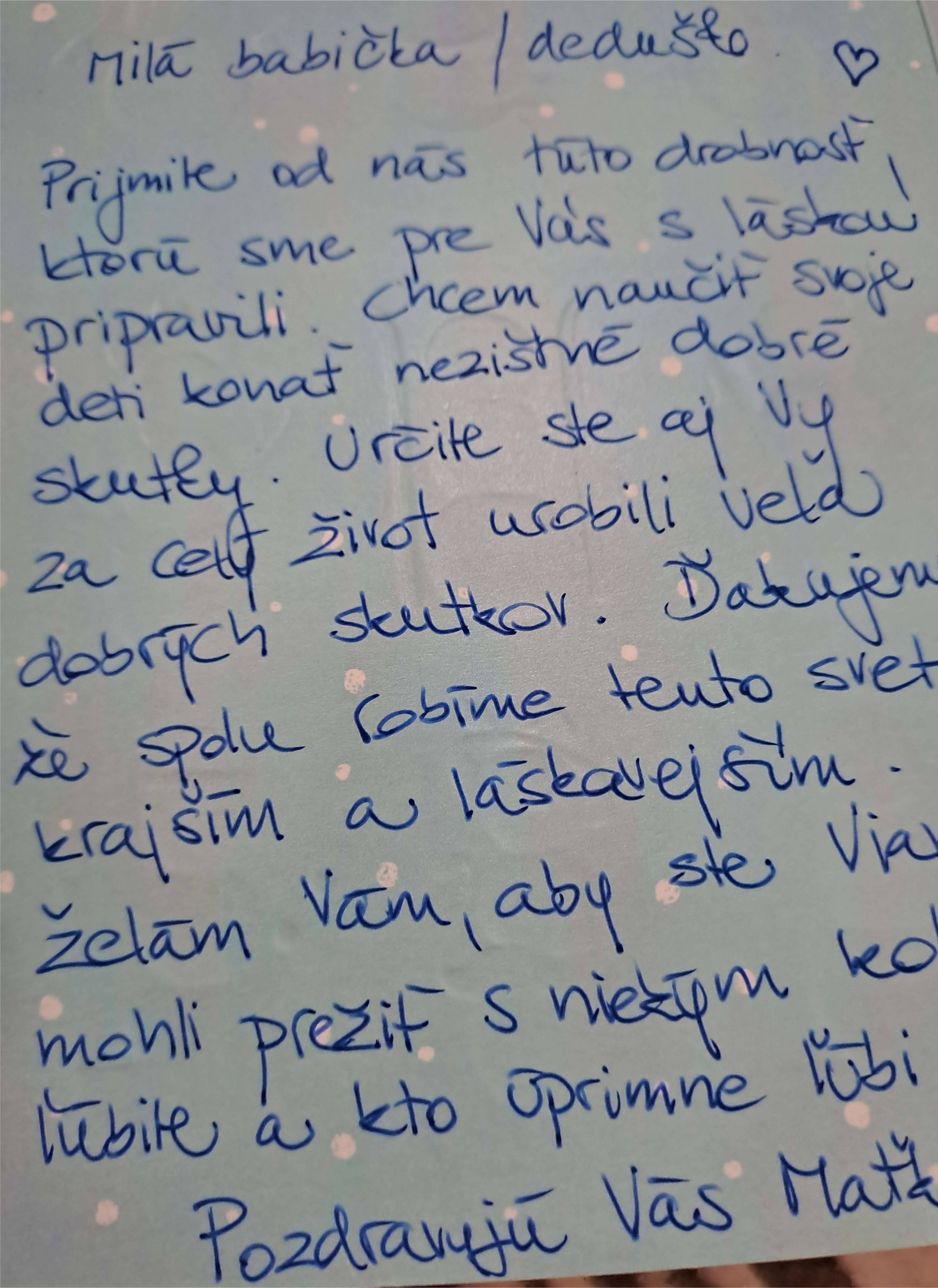 Milí rodičia, srdečne ĎAKUJEME, že ste naplnili krabicu od topánok maličkosťami, ktoré potešia osamelých seniorov. Často je to jediný darček, ktorý dostanú a niekedy aj posledný. Teším sa, že ste do krabice nezabudli vložiť aj kúsok svojho srdca /krásny list prikladam/... za našu materskú školu sme dnes odovzdali 44 krabičiek. Verím, že si deti odnesú z tejto akcie pocit pomoci, empatie a lásky k našim seniorom.